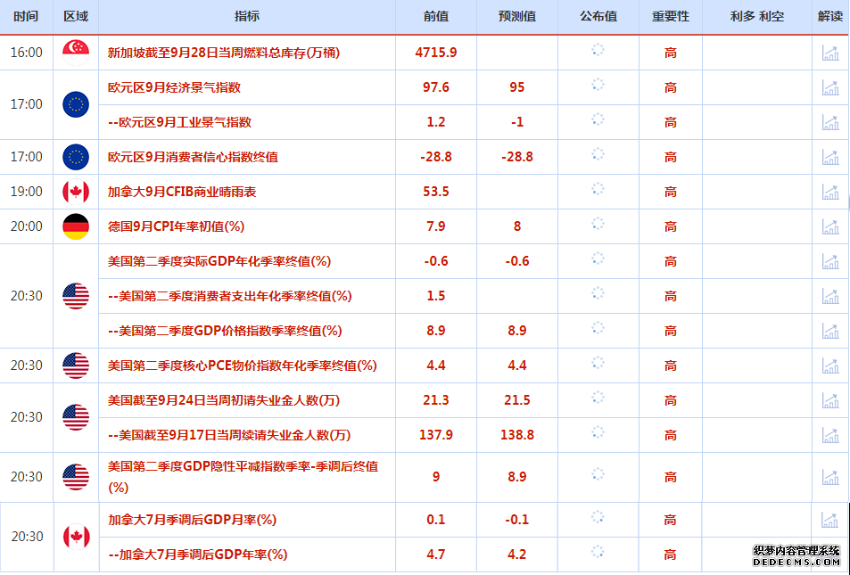 北京时间周四(9月29日)亚市早盘,美元指数交投于112.7附近。英镑兑美元扭转大跌走势反弹上扬,此前英国央行宣布将购买英国国债;美元和国债收益率回落,金价反弹,一度拉升近50美元;油价大涨5%,重回80关口上方,美国燃料库存数据显示降幅大于预期,消费者需求出现反弹。