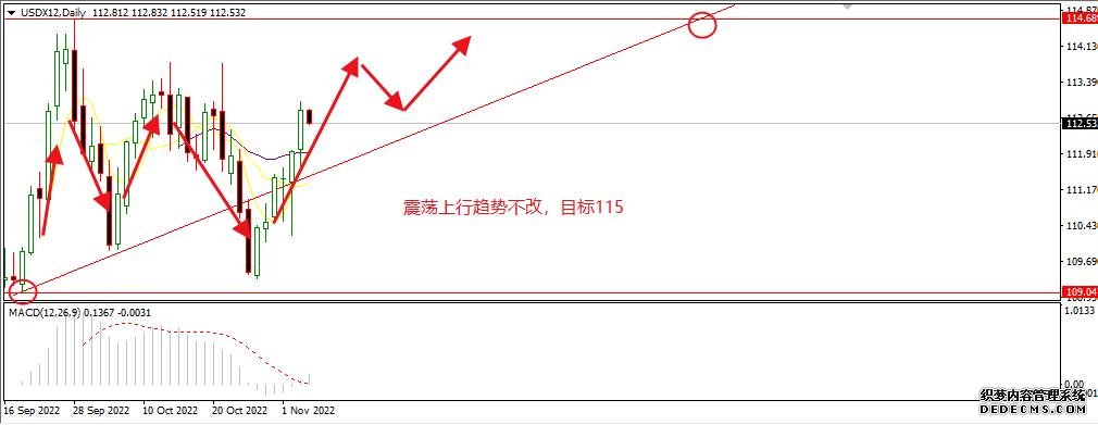 隔夜市场,美元加息的影响继续发酵,美元指数强势上涨0.77%,收于112.99。周四凌晨,美联储加息加息75个基点,符合市场预期,随后鲍威尔略带的讲话给预期紧缩政策放缓的人们一盆冷水,他表示现在考虑暂停加息还为时尚早。12月加息50个基点的概率相当大,但预计美联储最终加息目标会达到5%,比之前预期的峰值区域4.5--4.75%要高出一部分,且美联储有可能降低每次加息幅度,而拉长加息周期,可能会比预期的高利率周期多出3个月时间。今天晚上美国非农数据即将发布,投资者正密切关注此信息,如果非农数据超出预期,无疑会给予信心继续推进激进加息政策。另外,随着全球经济衰退的担忧加剧,作为避险资金低位的美元会受到市场追捧,也是推高美元指数的因素之一。